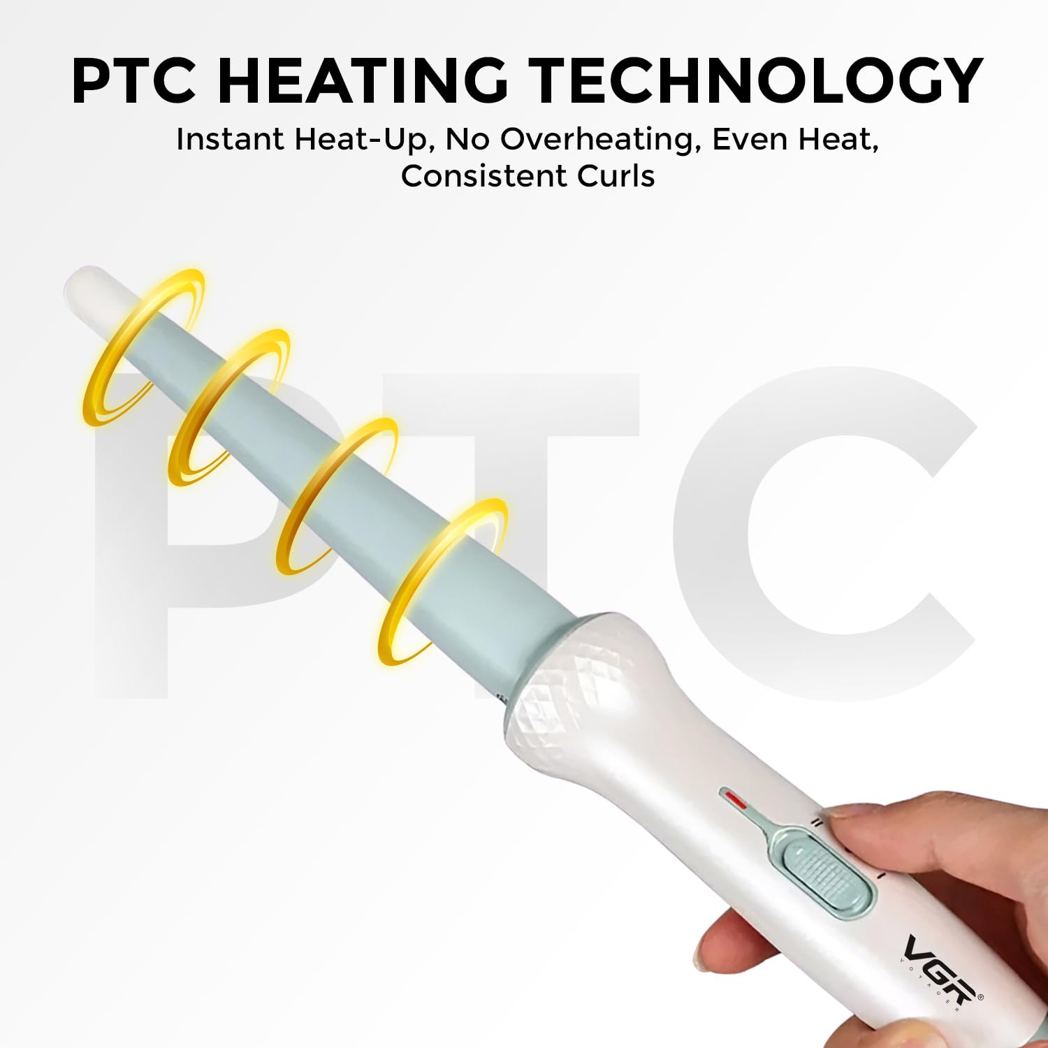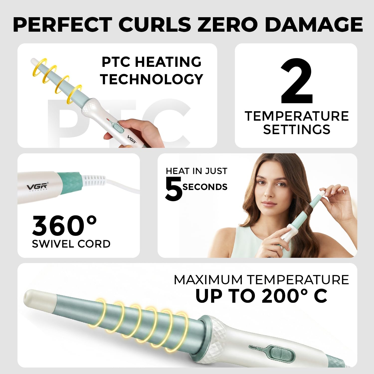 فرکننده حرفه‌ای مو VGR مدل V-596 یک وسیله حالت‌دهی کارآمد با طراحی مخروطی و روکش سرامیکی است که برای ایجاد فرهای زیبا و طبیعی روی انواع مو طراحی شده است . این دستگاه با قابلیت گرمایش سریع، دو سطح دمای قابل تنظیم و نوک خنک، تجربه‌ای آسان، ایمن و حرفه‌ای از فرکردن مو را در خانه برای شما فراهم می‌کند.