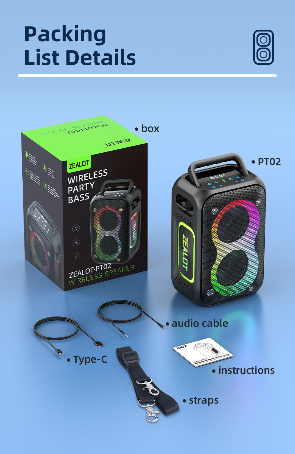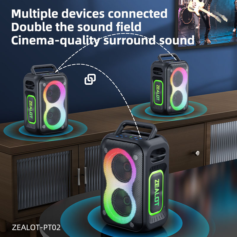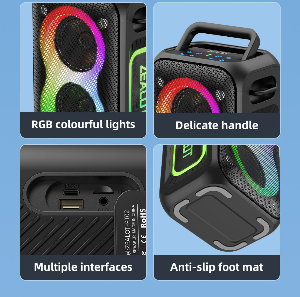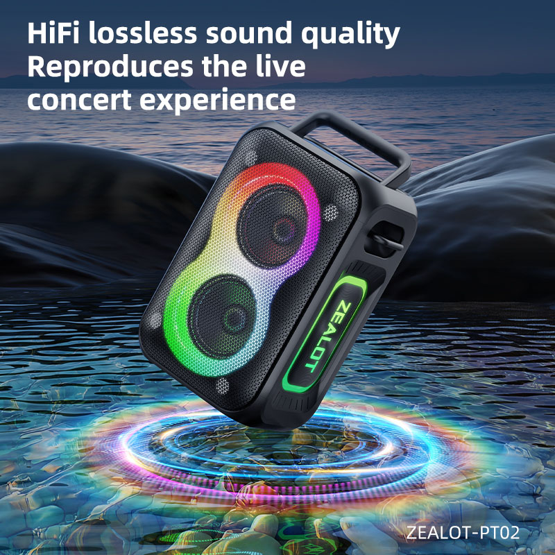 • هدف و مخاطب: Zealot PT02 برای کاربرانی طراحی شده که به دنبال تعادل عالی بین قدرت صدا، قابلیت حمل و قیمت هستند. این دستگاه برای مهمانی‌های کوچک در خانه یا حیاط، استفاده در سفر، کمپینگ و حتی به عنوان اسپیکر رومیزی با قابلیت نورپردازی گزینه‌ای ایده‌آل است.