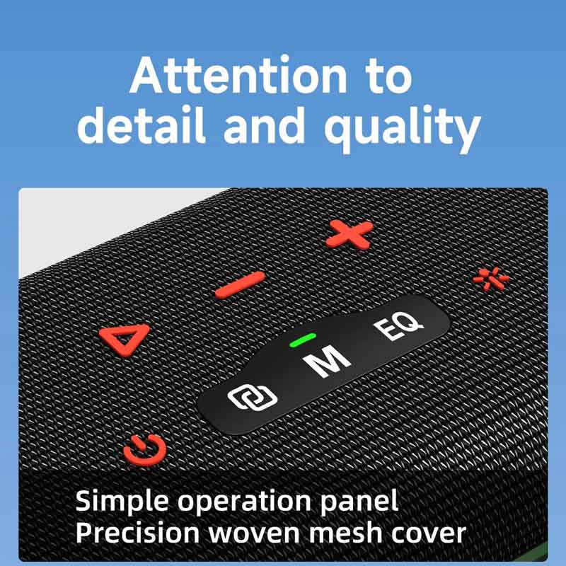 - طرازی بادوام و کاربرپسند: بدنه این اسپیکر از ترکیب پلاستیک مقاوم و فلز ساخته شده تا در برابر ضربه و شرایط سخت فضای باز دوام بیاورد. همچنین طراحی آن مجهز به یک دسته حمل مناسب برای جابجایی راحت است .